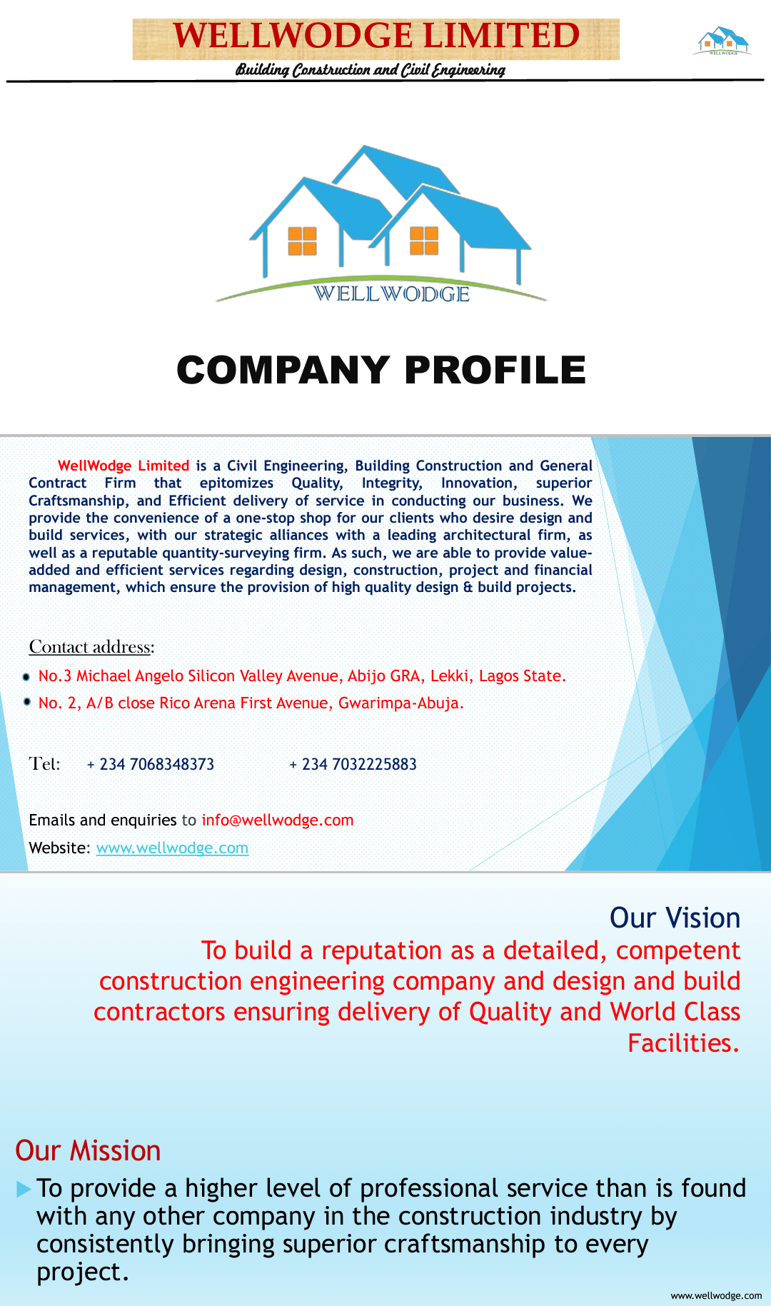 WellWodge Limited is a Civil Engineering, Building Construction and General Contract Firm Located in the heart of Lagos, Nigeria. They provide the convenience of a one-stop shop for our clients who desire design and build and construction services, project management, Interior works, tiling and Interlocks, Piling Services etc. Tyler Consortium handled their branding (Logo redesign, Company profile, redesigned and currently Manage their website.